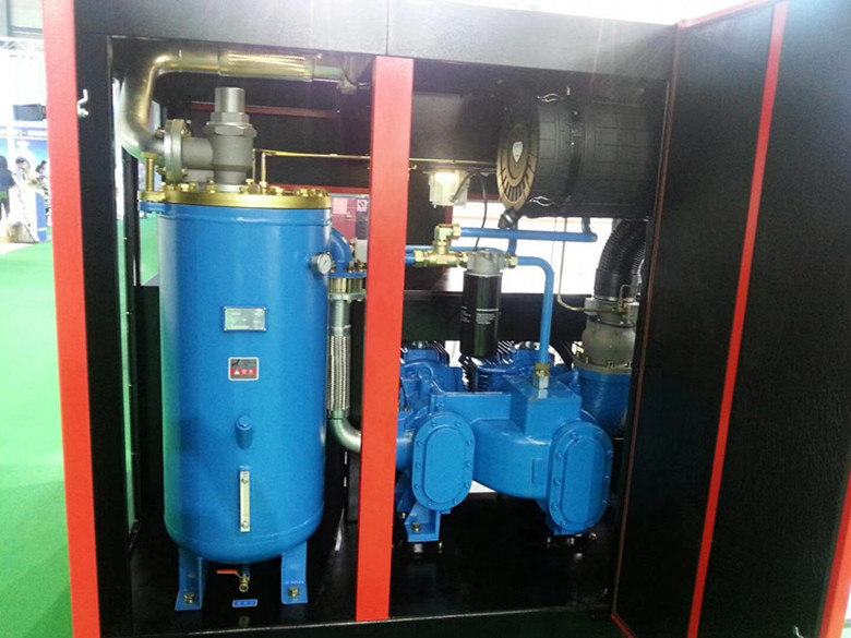 The stepless speed regulation two-stage compression main machine is adopt, and that first-stage compression rotor and the second-stage compression rotor are combined in a shell and horizontally opposite to each other, and are respectively driven coaxially by two high-efficiency permanent magnet motor. Natural air enter that first stage of compression through an air filter and an intake valve, is mix with a small amount of lubrication oil in a compression chamber, and simultaneously compresses the mix gas to an interstage pressure. The compressed gas enters the cooling channel and comes into contact with a large amount of oil mist, thereby greatly reducing the temperature. The cooled compressed gas enters the second-stage rotor for secondary compression and is compressed to the final exhaust pressure.